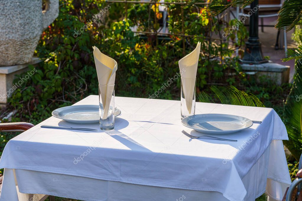 Стол на двоих с белой скатертью в уличном ресторане на фоне зелени