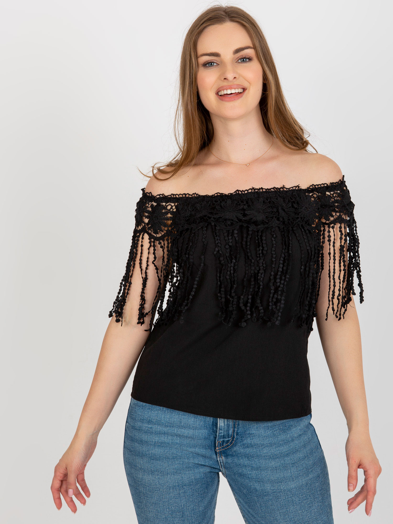 Блуза с къс ръкав и детайл с дантела, с ресни в черно