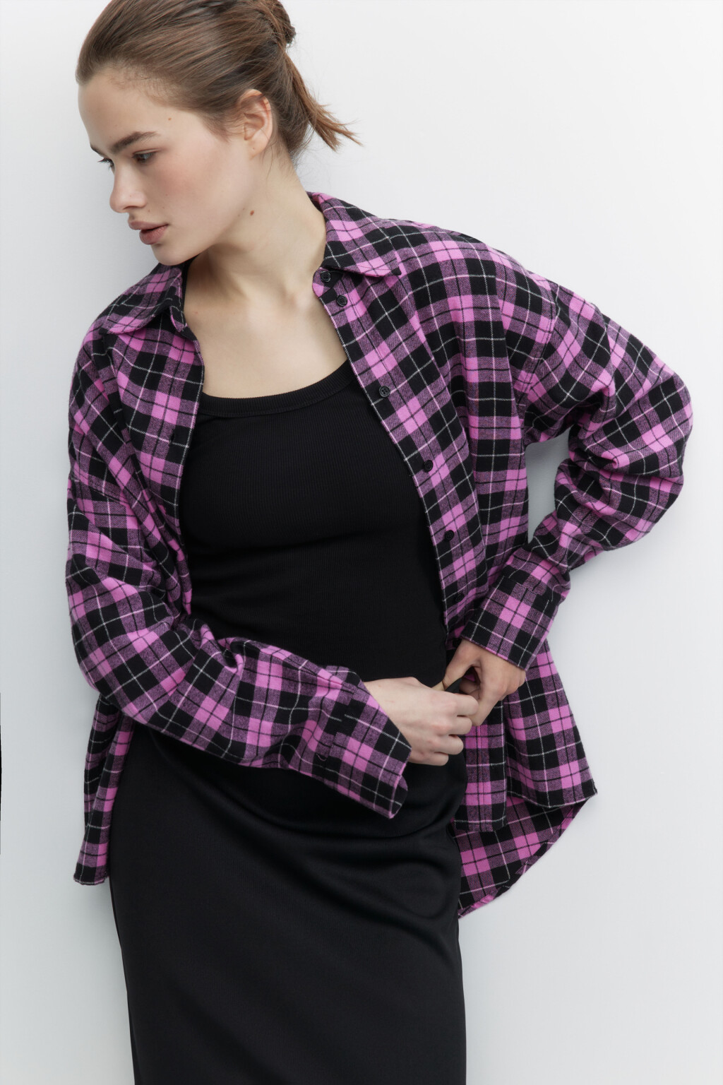 Рубашка в клетку с капюшоном, подол на кулиске с карманами. Женские