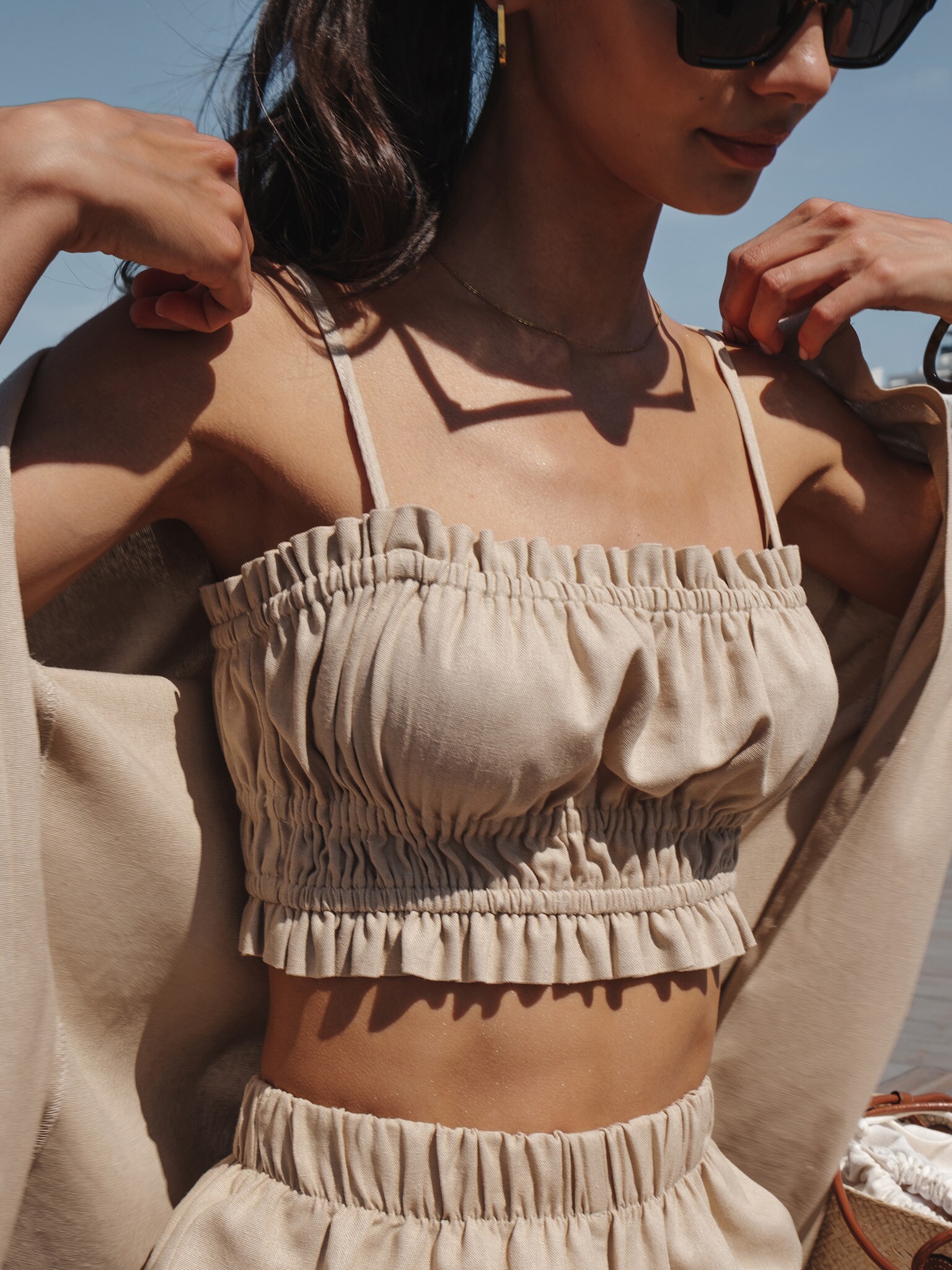 Льняной топ на бретелях с эластичными сборками :: LICHI